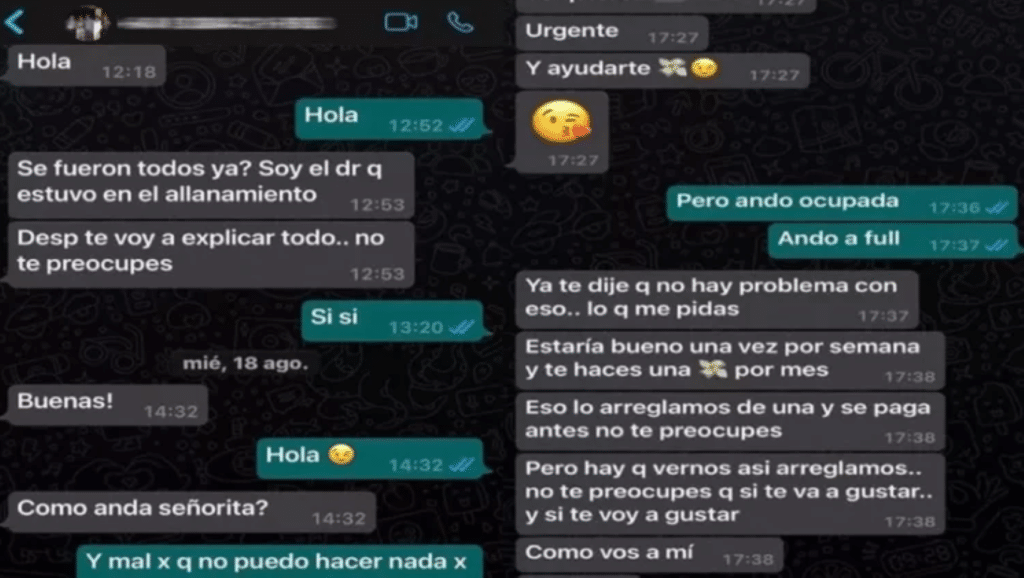 Luego del procedimiento judicial, la dueña del inmueble allanado recibió un mensaje a través de Whatsapp, donde el ayudante fiscal que se había presentado como tal, le habría propuesto favores sexuales a cambio de «arreglar esas cuestiones», haciendo referencia al procedimiento judicial que estuvo a cargo.