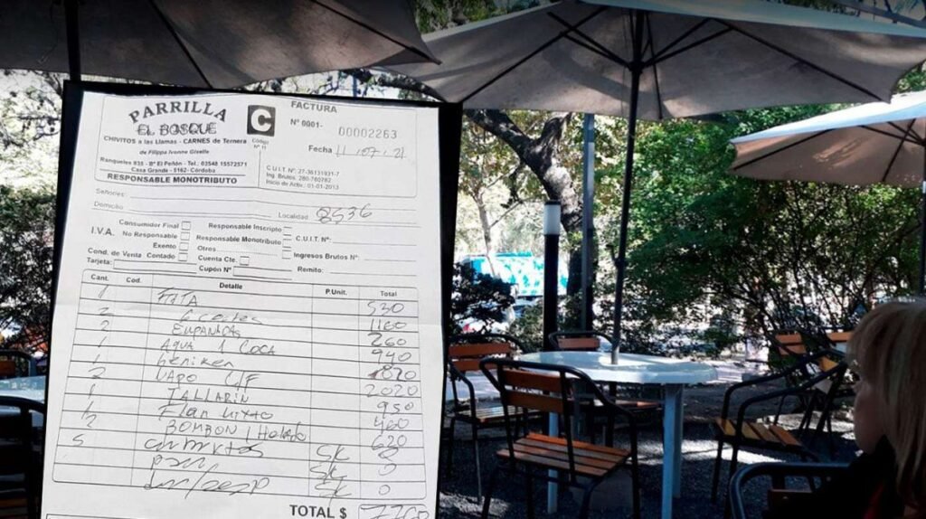 La mujer llamó al encargado de “Parrilla El Bosque” y expuso su malestar tras chequear nuevamente el detalle de la factura: una porción de papas fritas a $530, dos promociones de parrillada -”seis cortes”- a $1160, dos empanadas a $260, un agua y una gaseosa a $940, una cerveza de litro a $820, dos milanesas a la napolitana con papas fritas a $2020, un plato de tallarines con crema a $950, un flan mixto a $460 y dos “bombón helado” a $620. El precio final era de $7760.