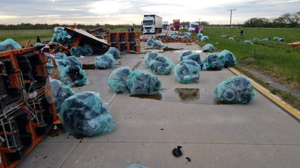 El camión que transportaba motores quedó tumbado en la calzada y la mercadería desparramada entre San Jerónimo del Sauce y Sa Pereyra.