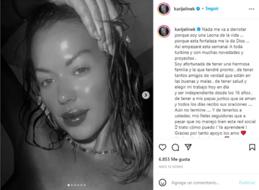 Además, Karina aprovechó para agradecer por los aspectos positivos de su vida y no descartó cumplir su sueño de tener un bebé: “Soy afortunada de tener una hermosa familia y la que tendré pronto, de tener tantos amigos de verdad que están en las buenas y malas, de tener salud y elegir mi trabajo hoy en día y ser independiente desde los 16 años, de tener a mis papás juntos que se aman y todos los días recibo sus oraciones”.