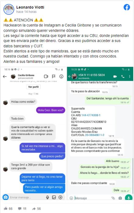Se trata de una maniobra delictiva cada vez más común. De alguna forma, los malhechores logran hacerse de la identidad digital de la víctima. Y comienzan a enviar mensajes a sus contactos o bien vendiendo dólares o bien asegurando que necesita -por algún argumento- un dinero importante en corto tiempo. En cualquiera de las versiones, el delincuente se abusa de la confianza de la segunda víctima, dado que piensa que habla con alguien conocido.