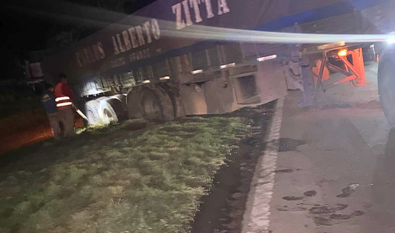 Al intentar realizar una maniobra de giro en “U” para retomar la Ruta Nacional 34, el acoplado se deslizó hacia la banquina, que se encontraba inestable, provocando que el vehículo quedara inmovilizado sobre el asfalto.