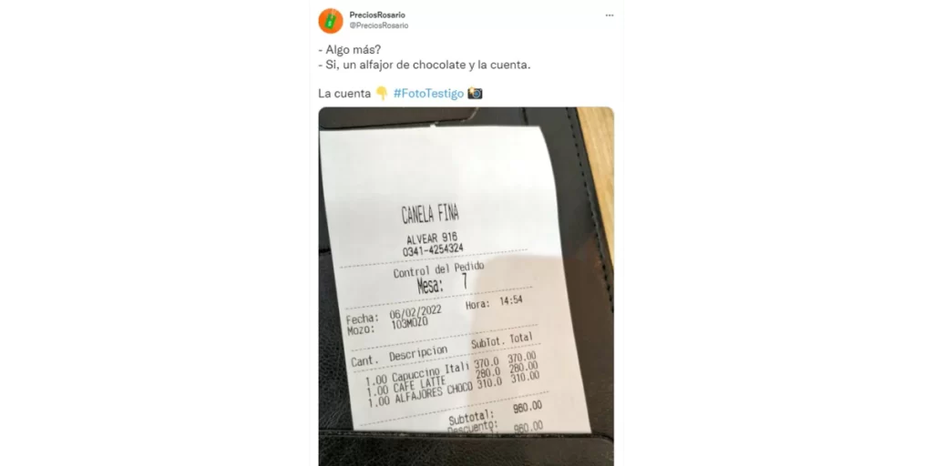 La cuenta oficial de Twitter llamada “@PreciosRosario”, compartió la foto que causó el gran escándalo. En el ticket se puede ver que uno de los cafés, un capuccino, salió 370 pesos, el otro, un latte, 280 pesos y, por último, el alfajor costó 310 pesos. Lo que llevó a un total de 960 pesos.