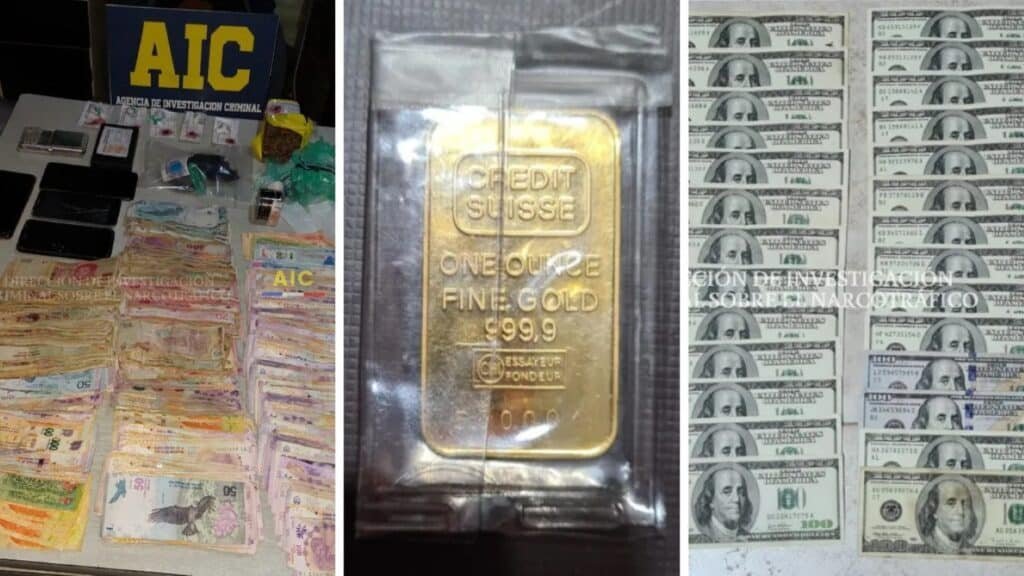 Uno de los aspectos que llamó la atención del procedimiento fue la presencia de oro entre el material secuestrado. Al respecto, el fiscal Salum explicó a AIRE que se trata de lingotes de oro puro. «Es una especie de oro que tiene una certificación en cuanto a la pureza y el peso que tiene el mismo, tiene un valor bastante alto, es una forma de atesoramiento de valores», confirmó Salum en diálogo con José Curiotto en el programa Creo.