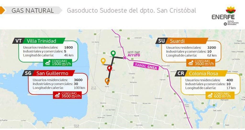 “En cuanto al área de cobertura, se incluye el tramo Arrufó, Villa Trinidad, Colonia Rosa, San Guillermo y Suardi, que se beneficiarán con el suministro de gas natural para usos residenciales, comerciales, de servicios, vehiculares, productivos e industriales, así como para sectores que no cuentan con un suministro adecuado de este recurso crítico”.