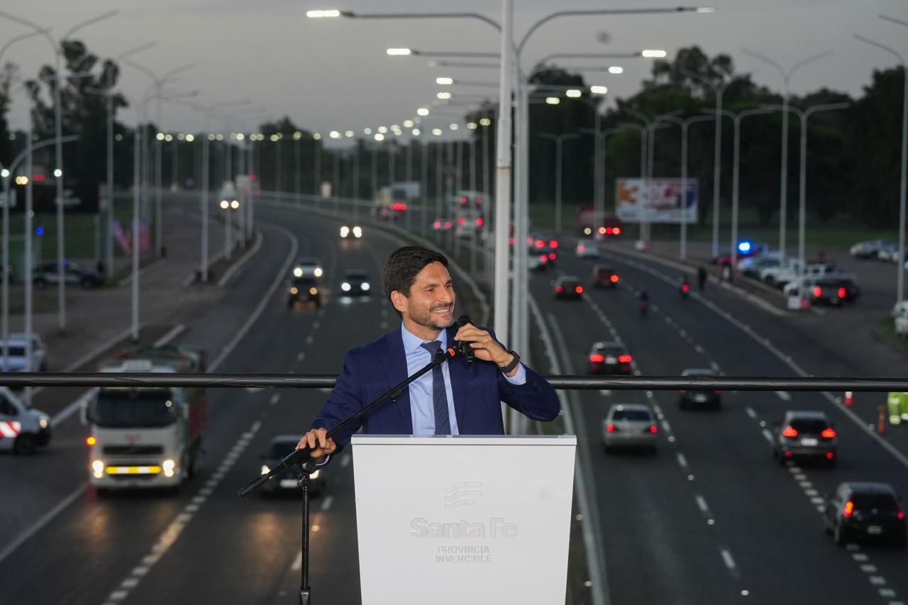 El gobernador Maximiliano Pullaro inauguró el tercer carril de la Autopista Rosario-Santa Fe, en un acto realizado sobre el puente del kilómetro 0, en el ingreso a Rosario.