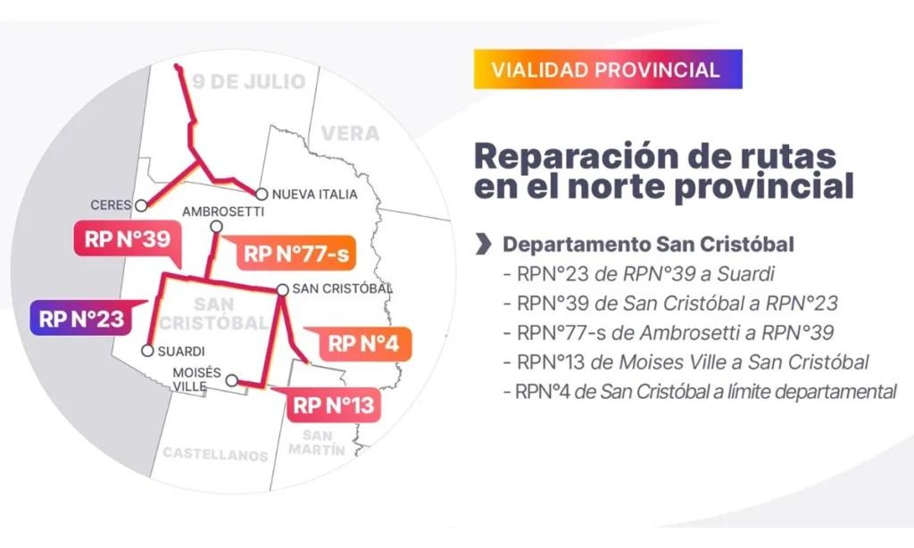 Se desarrollan intervenciones en 5 rutas provinciales, abarcando más de 200 kilómetros entre las rutas 23, 39, 13, 4 y 77s que pasan por el departamento San Cristóbal.