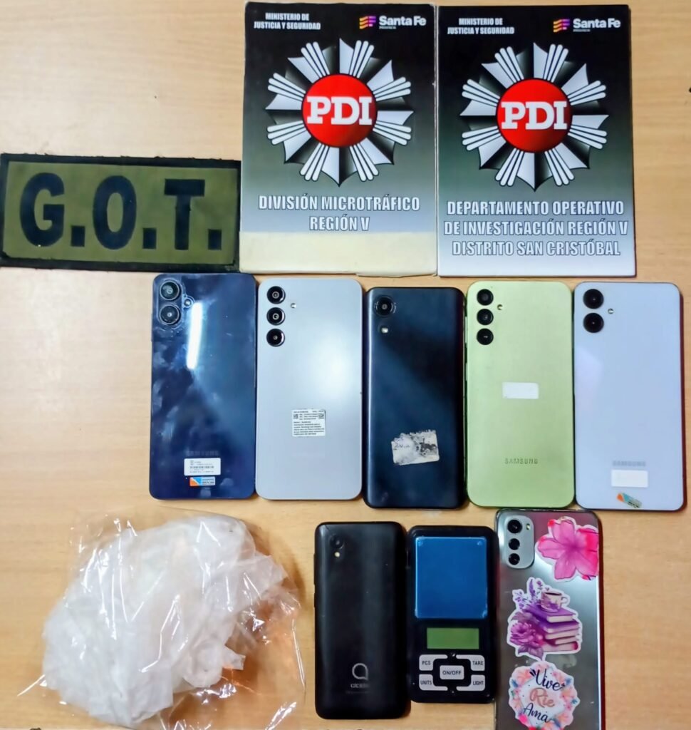 Durante el procedimiento, fueron identificadas ocho personas: cinco adultos y tres menores. Asimismo, se secuestraron siete teléfonos celulares, bolsas de nylon con recortes circulares y una balanza de precisión, elementos comúnmente utilizados para el fraccionamiento y distribución de estupefacientes.
