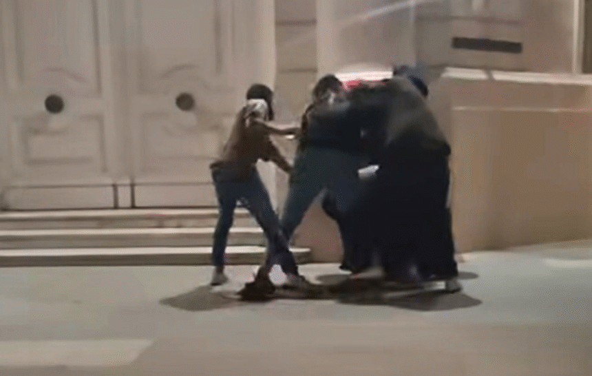 Siete personas atacaron a un joven frente al Banco Nación. Una mujer lo interceptó con una patada y luego fue golpeado a puño limpio por el resto del grupo.