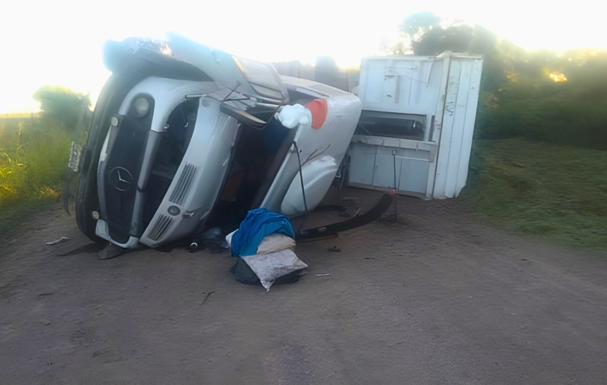Un camión Mercedes Benz volcó en el paraje La Cristiani. Su conductor, un hombre de 46 años, fue trasladado al hospital con lesiones leves.