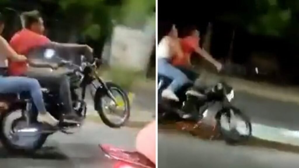 En determinado momento, el joven de la motocicleta que circula a la izquierda intenta un hacer “willy”, y medianamente lo logra, pero al regresar la rueda delantera y aterrizar sobre el asfalto, el peso de la pareja hace que pierda el equilibrio, y la moto, cuya parte trasera inclusive choca con el piso provocando chispas y cae del lado izquierdo.