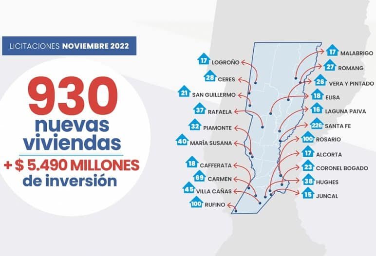 Viviendas en San Guillermo y Ceres, La inversión abarca a los distritos de Coronel Bogado (23 unidades habitacionales), Villa Cañás (45), Carmen (69), Cafferata (18), Laguna Paiva (16), Vera y Pintado (26), María Susana (40), Piamonte (32), Romang (27), Malabrigo (17), Alcorta (17), Juncal (15), Hughes (38), Elisa (18), San Guillermo (21), Ceres (28), Logroño (17), Rufino (100), Rafaela (37), Santa Fe (226) y Rosario (100).